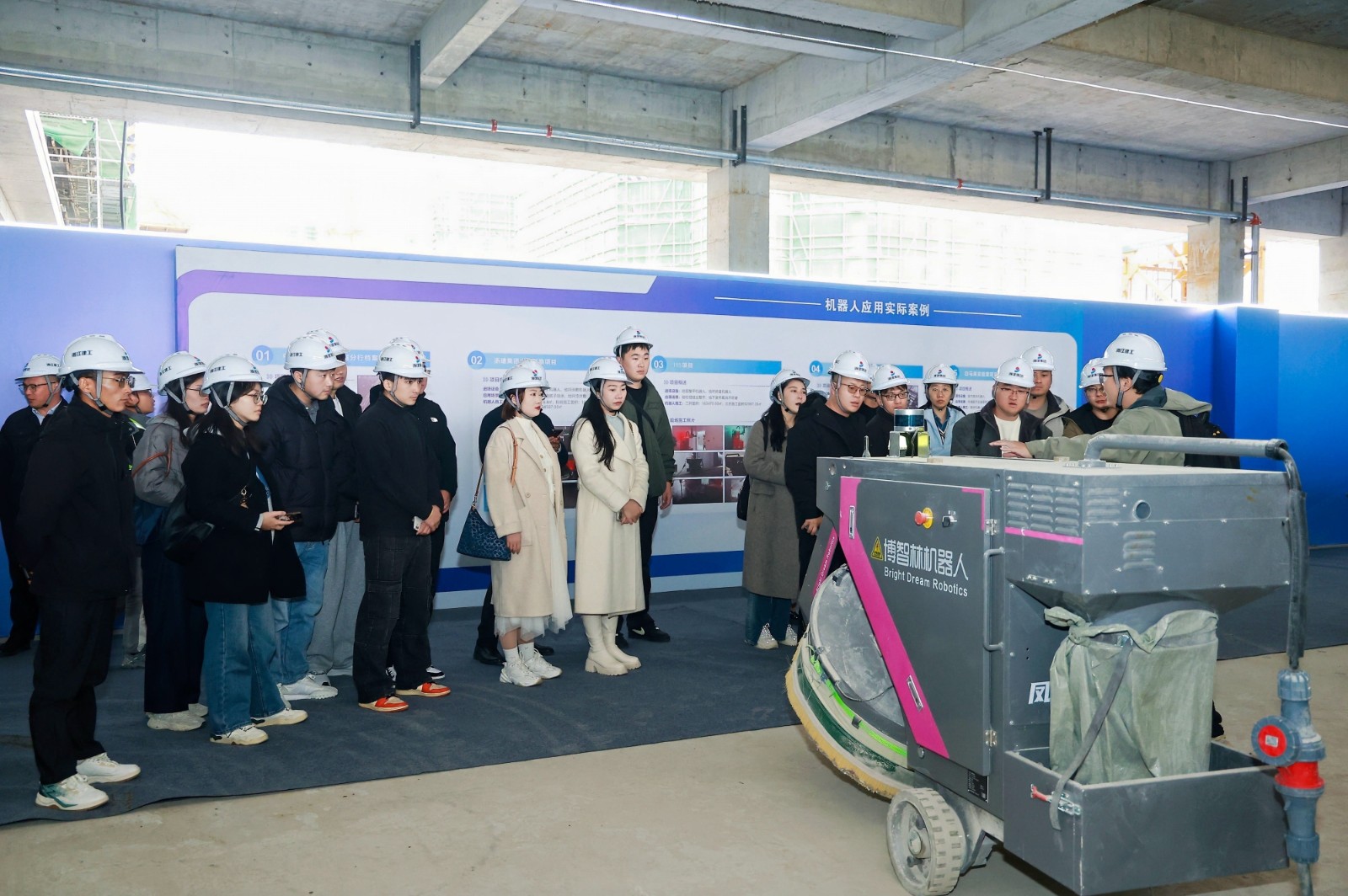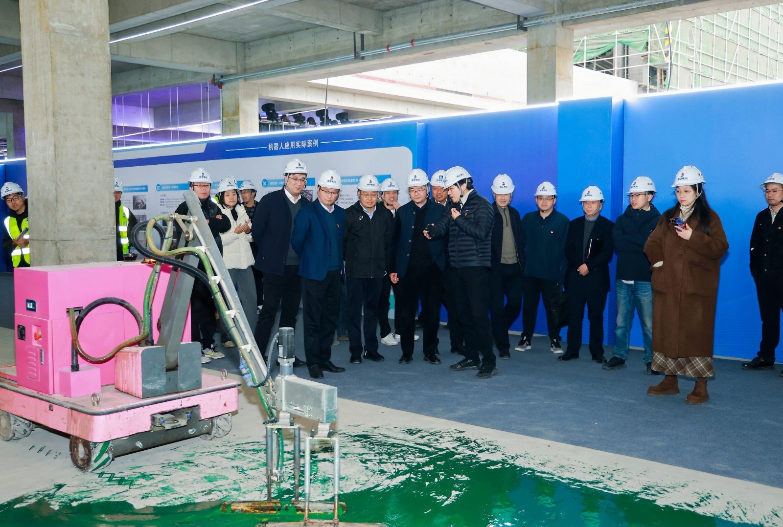 与会人员实地参观了项目党建文化园地、“党建+”创新展示区、智能建造体系及智能施工展示区。在智能施工展示区,大家看到的不再是模型与展板,而是真实运转的机器人施工场景:地面整平机器人自动校准标高,墙面抹灰机器人连续作业,直观感受了党建工作与生产深度融合的实践成果。